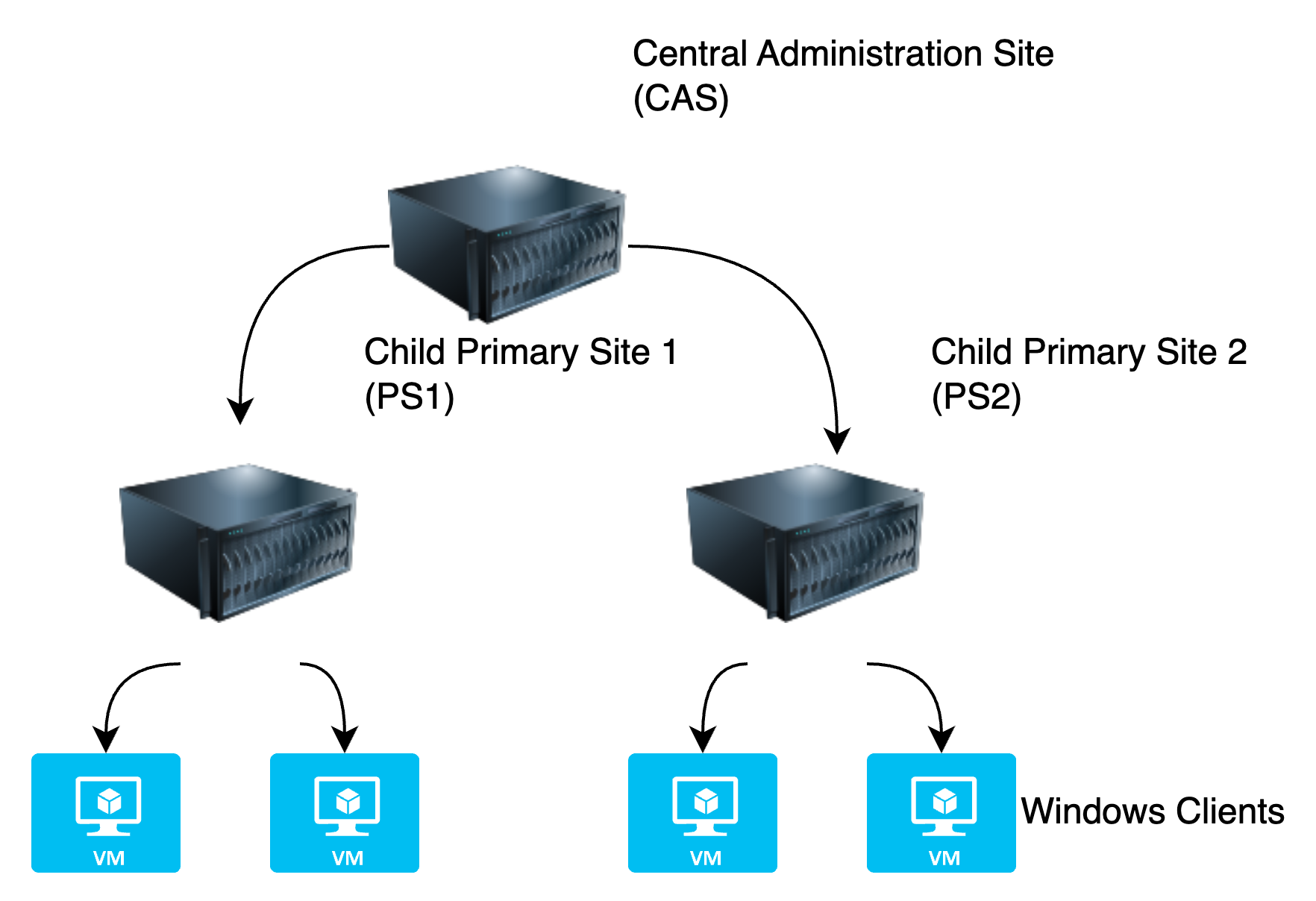 The lab environment consists of a Active Directory domain and three additional Windows Server virtual machines running Configuration Manager and SQL co-located on the same system. There is a Central Administration Site (CAS) and two Child Primary Sites (PS1 and PS2). Additionally, there is a Windows 10 and a Windows 11 client assigned to each site.