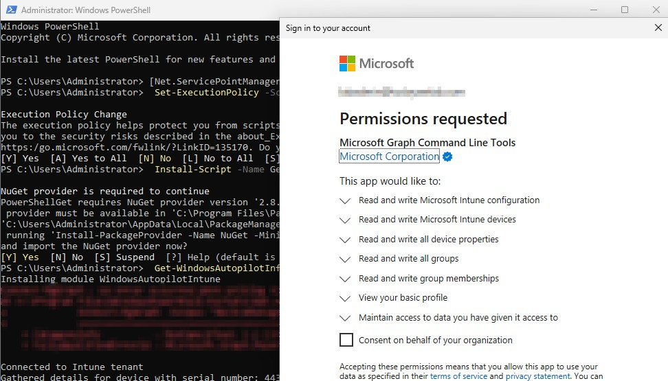 The first time this is executed on a device some prompts are needed to install the necessary components for NuGet and the script as well as a one-time registration to grant admin consent. This does also include the WindowsAutopilotIntune module.